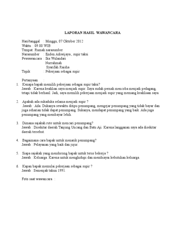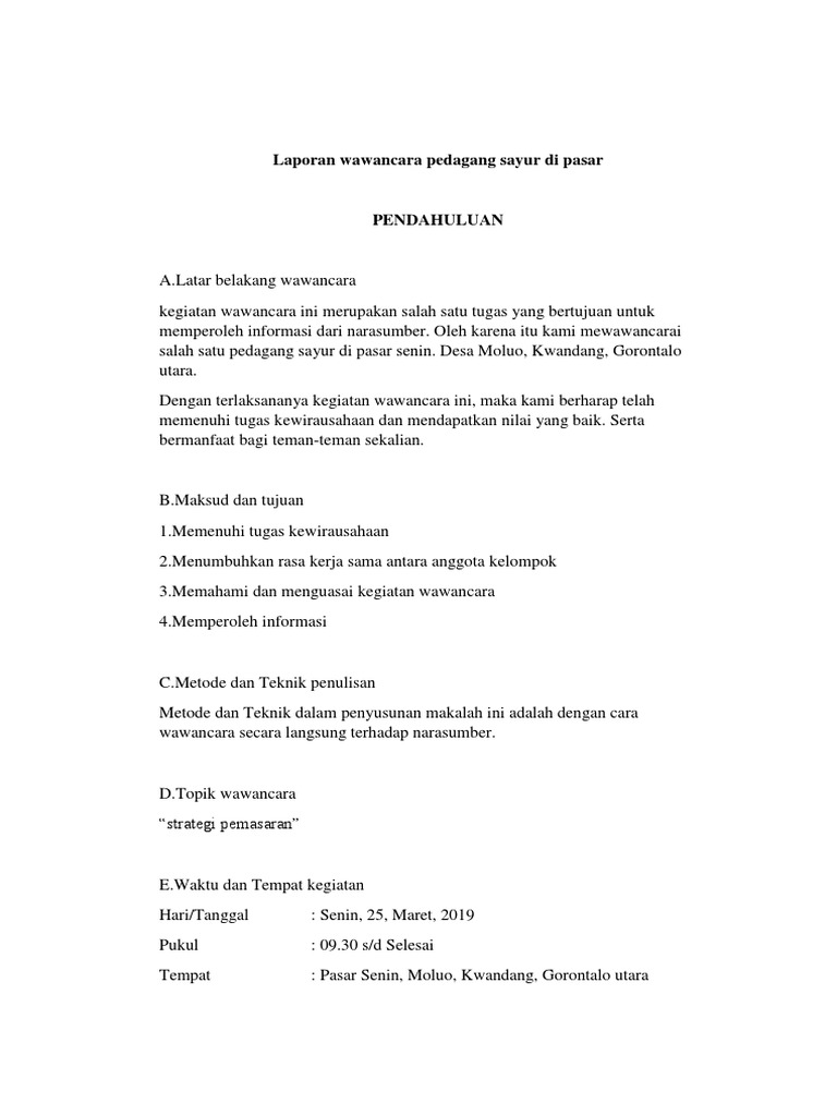 Contoh laporan hasil wawancara dalam bentuk makalah 9n0o1mg55knv. Contoh laporan hasil wawancara dengan pedagang sayur kumpulan. Contoh wawancara pedagang dubai burj khalifas. Jul 09, 2020 · laporan wawancara smpn 1 patia. Makalah wawancara kewirausahaan contoh makalah.